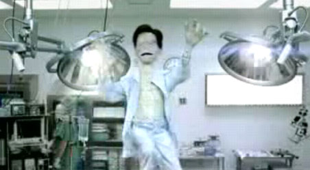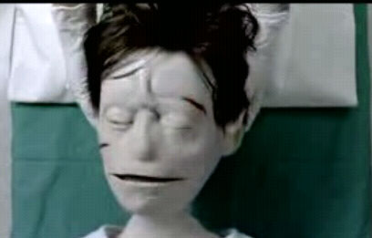 You see the figure being tended as it is put into an ambulance, then sent down a hospital corridor on a trolley, the camera above him capturing the face as well as the floor rolling past and the feet of the person pulling the trolley. In the operating theatre, the surgeons do their stuff and leave, and the figure leaps up and dances wildly and jerkily, all the while singing and making appropriate facial expressions, before collapsing dejectedly.