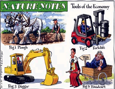 The Times kindly illustrated some of my subjects in Peter Brookes’ cartoon on the following day. The title was “Tools of the Economy” and four pictures showed in sequence a horse-drawn plough, a fork-lift, a big yellow digger – and Gordon Brown, with Darling under his arm, being dragged in a handcart by an ermine-clad Lord Mandelson past a sign pointing to Hell one mile away.
