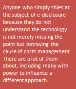 Technology, I said, is merely servant to all of them. Anyone who simply shies at the subject of e-disclosure because they do not understand the technology is not merely missing the point but betraying the cause of costs management. There are a lot of them about, including many with power to influence a different approach.