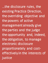 In my view, the substance of this Practice Direction is excellent and it makes appropriate provision for e-disclosure. On the assumption that this Practice Direction will be approved in substantially its present form by the Rule Committee, I do not make any recommendation for procedural reform in relation to e-disclosure [Para 2.5 on page 366].