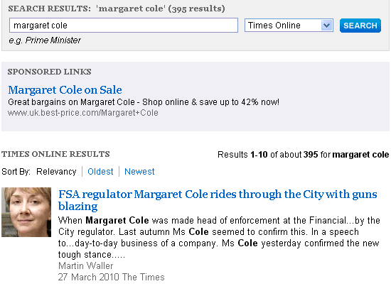 I came across this targeting point in a different context this morning. Searching in The Times Online for the name of Margaret Cole, the Director of Enforcement and Financial Crime at the FSA, for a proposed article about regulatory investigations, I was surprised to find that I could save up to 42% with “great bargains on Margaret Cole” from one of the grapeshot price-aggregating sites. We certainly need one Margaret Cole, but I’m not sure that we need to shop around for a discounted one. Unsurprisingly, the site had none on offer, though purporting to come up with 693 matches.