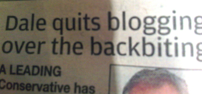 I thought of it yesterday morning when Simon Price of Recommind kindly sent me a photograph of the newspaper headline shown above: Dale quits blogging over the backbiting. Fortunately, I already knew that the well-known Conservative commentator Iain Dale had announced yesterday that he was giving up his blog, so I knew it was not about me.