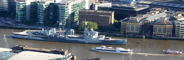 … and HMS Belfast, whose forward guns are apparently trained on the South Mimms service station. The grotesquely expensive white elephant at Stratford would therefore be well within range of the aft turrets when the sponsorship-with-added-hop-skip-and-jump is over in July.