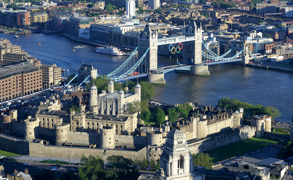 … the Tower of London and Tower Bridge, the latter decorated with the emblem of some sporting event which we are, apparently, banned by law from mentioning for fear of compromising the financial interests of the sponsors…