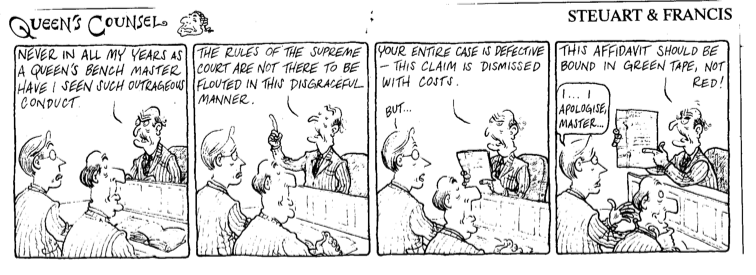 You might also like the contribution from Tim Strong, a litigation partner at Taylor Wessing.  He tells of a judge whose procedural focus seemed to be on the proper way to bind pages together. Tim’s story reminded me of my favourite legal cartoon (from Steuart & Francis in the Times, years ago):