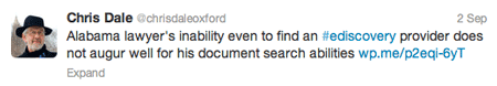 Ignorance about eDiscovery, and of the tools and processes available to deal with it, is not a particular characteristic of Alabama, and is just as prevalent in Manhattan and the City of London. My theme indeed (to anticipate somewhat) is that a small firm in Alabama or in an equivalent English suburb or provincial city might easily run rings round a bigger firm if they have the right skills and project partners.