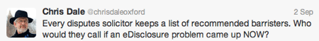 He was right, of course, to draw attention to the ambiguity. I did indeed mean that solicitors ought to have a list of eDisclosure providers to hand, preferably companies they know something about, in the same way as they know something about the barristers whom they instruct in esoteric matters of law. They might usefully, however, also get to know some barristers who are skilled in eDisclosure and who can leap to their aid when disclosure issues arise.