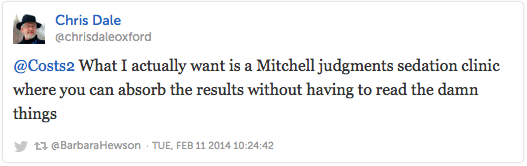 My Twitter timeline was full of barristers and solicitors reporting on their adventures, lamenting the elevation of procedure over justice and giving each other survival tips. I will spare you the details – look at the blogs maintained by Gordon Exall and Kerry Underwood for that. All I want to convey here is that Twitter has come into its own as a communications medium through what has been a near-crisis in civil procedure. What we witnessed, day by day, was not just procedural fierceness but the breakdown of the cooperation between lawyers which keeps the wheels turning, the clogging of the courts with the applications made necessary by the new ban on agreed extensions and, in place of the certainty which we were promised, an apparent lottery as some judges rebelled against the new regime and wrote carefully-worded judgments which distinguished the case before them from Mitchell.