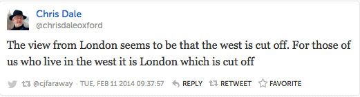Our journey home took a little over six hours, aided by 200 mph tailwinds. From snow and slush we moved to rain and rising floodwaters, with London more or less cut off from the West (note which way round I put that) by flooded railway lines.