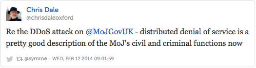 Another theme opened up on Twitter as a solicitor complained about delays in getting a hearing date in the Commercial Court. We have as Lord Chancellor (I was ticked off during the week for so describing the non-lawyer Grayling) a man who was given the job precisely because he had no understanding of the importance of law and would therefore not let respect for it interfere with the task of hacking it to pieces; the Ministry of Justice is staffed now largely by those who have been unable – too dim, too useless, too much like lapdogs to their lying master – to get jobs elsewhere. Grayling rewards his civil servants by blaming them when his statistics are shown to be false.