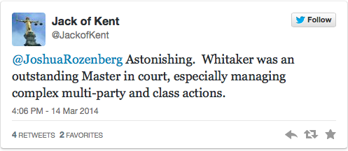 While I was away, Steven Whitaker resigned as Senior Master of the Senior Courts in the Queen’s Bench Division. Steven Whitaker’s skill lay in making procedure the servant of justice; the prevailing orthodoxy is that procedure is an end in itself, with individual justice in individual cases subordinated to efficiency at all costs.