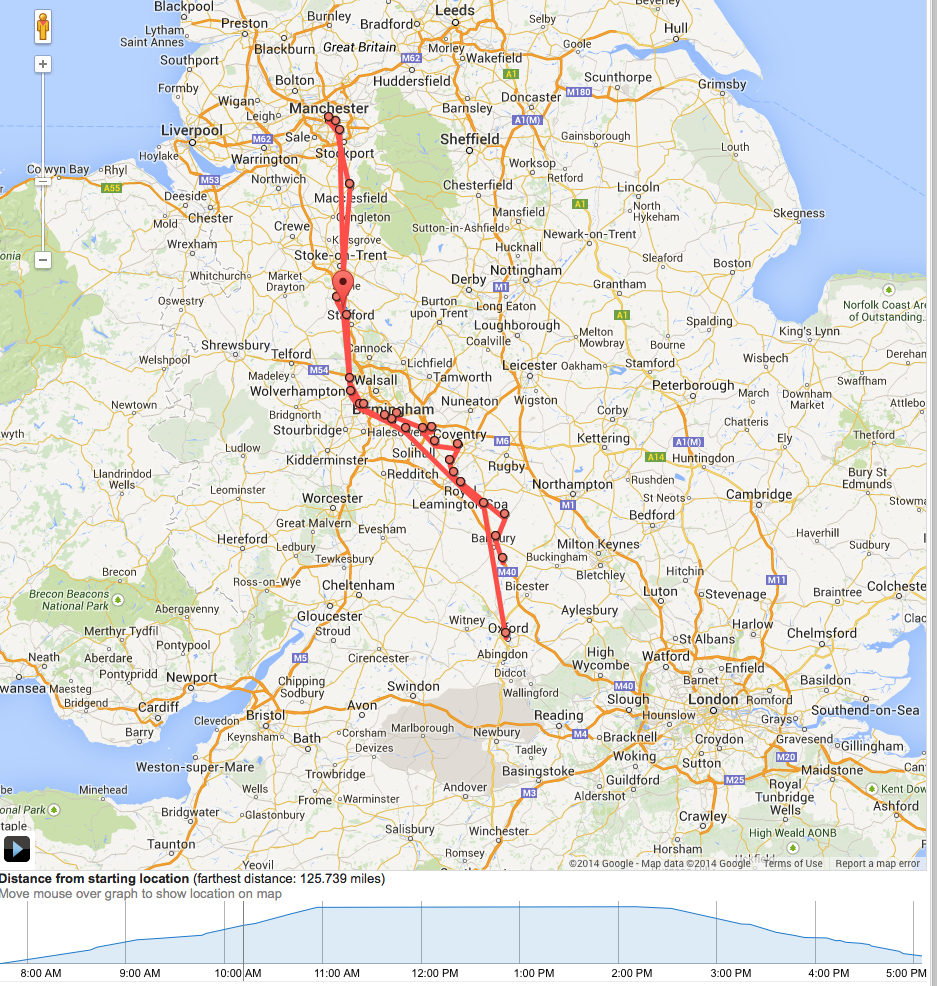Craig’s article told me something I had forgotten – that you can look up your own travel history via Google. Here is mine for a visit to Manchester earlier this week:
