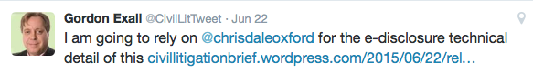 Gordon has gathered more than 3,500 Twitter followers. Many of his tweets link to his own posts or to other significant sources; he engages in discussion about them and other things related to law and procedure; much of his Twitter feed is cheerful chatter of the kind which lightens the day and keeps followers interested; he is generous to others with retweets and favorites, as well as things like this::