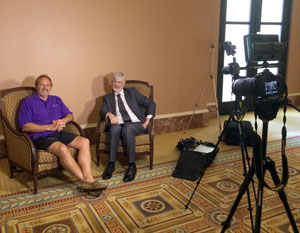 My son Charlie and I recorded 14 videos over two days. The usually quiet corridor which is my usual film set was much disrupted – it had become the entrance to the exhibit hall, a construction site with music, vacuum-cleaners and electric drills, the office of a woman with the vocal subtlety of a donkey, and the stomping-ground of a union official questioning our purpose because the hotel is a closed shop for technical services like video – we were all right because we were serving an educational purpose. After doing a couple of recordings against a very dull brown wall (as in the picture above, with Ian Campbell of iCONECT), we resorted to private suites and, in a couple of cases, the corner of Charlie’s bedroom.
