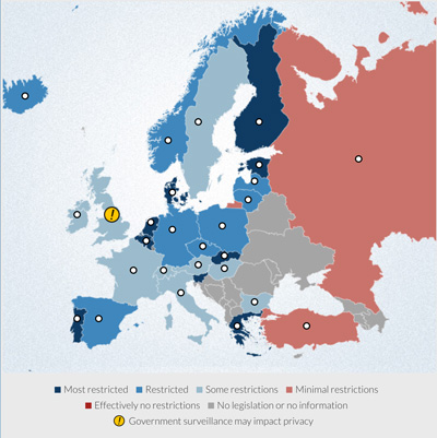 You can tour the world, continent by continent and country by country and get a broad picture of the regimes applicable in each jurisdiction. Some places, the UK included, carry a yellow flag to indicate that “Government surveillance may impact privacy”.
