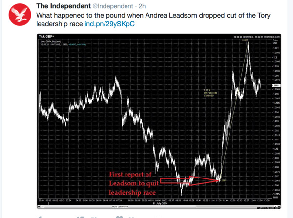 At this point, Andrea Leadsom pulled out of the race, leaving Theresa May the only contender as leader of the Conservative Party and therefore Prime Minister in waiting. The markets shot up – Leadsom’s role in the last economic crisis may have been overstated in her CV, but she will be gratified by her influence on this one.