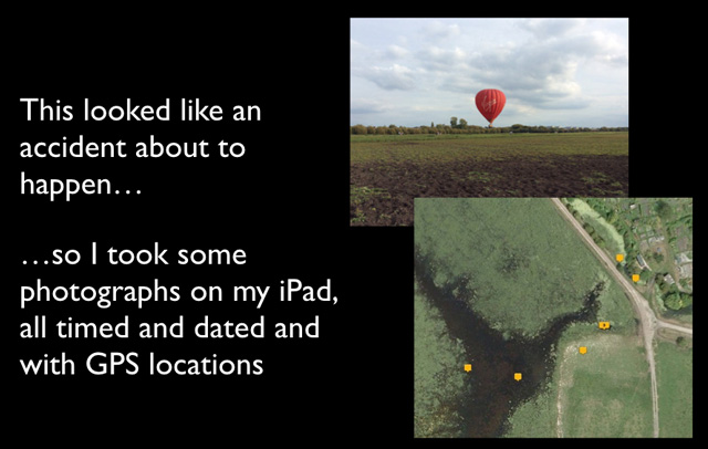 I bang on a lot about the evidence (hold on to that word “evidence”) which is created daily by all of us, often without our realising it, through our interactions with social media and other web resources, and in the photographs taken by us or by others. One of my stock examples involves me taking photographs on my iPad of a potential balloon accident.