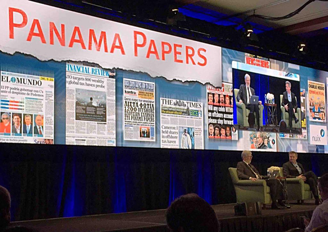 I don’t usually care too much about the setting for my sessions – I have my back to it anyway and care only that the audience is not distracted by moving things or overdone slides. Grant Whitehouse, Director, Branding Campaigns at Nuix, did us proud with his setting for our Panama Papers session. If one was in any doubt about the significance of the work of the International Consortium of Investigative Journalists, the headlines above us would remove it.