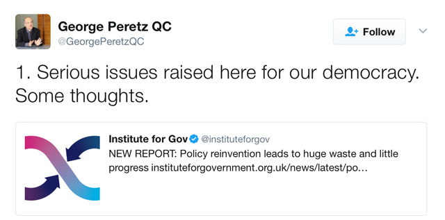 A Twitter thread from George Peretz QC draws attention to an article from the Institute for Government called Policy reinvention leads to huge waste and little progress.