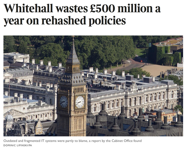 Much the same ground was covered in an article in The Times on 24 January called Whitehall wastes £500 million a year on rehashed policies (subscription required).