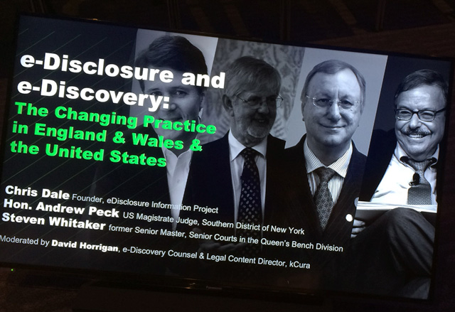 My second panel was called eDisclosure / eDiscovery: the changing practice in England and Wales and the United States. The US was represented by US Magistrate Judge Andrew Peck, one of the few US judges to understand both the similarities and the differences between the two systems, and by moderator David Horrigan of kCura. The team for England and Wales was former Senior Master Steven Whitaker and me.