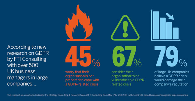 Research by FTI Consulting with more than 500 UK business managers in large companies shows that there remains considerable concern about the ability of organisations to cope with a GDPR related crisis, about their organisations’ vulnerability and about the potential damage to their reputation if such an event took place. Talk-Talk and British Airways are examples of companies which faced very substantial public backlash following some kind of failure (not just GDPR privacy-related failure) for which they were evidently unprepared.