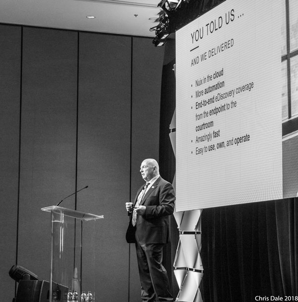 Users wanted Nuix to be more in the cloud. They wanted more automation and closer orchestration of all Nuix products in a seamless environment. They wanted a more complete solution “from endpoint to courtroom”, and wanted to get their eyes quickly onto the documents which mattered. New problems arose and old ones expanded – he referred in particular to the proliferation of different types of data and the complexity of dealing with social media. Clients wanted to be able to “ask any question of the data”, for discovery, forensics, incident response and compliance, with the GDPR as an obvious example of an imperative. Users needed to get closer to the point of an event with near real-time response, closing the gap between an incident and the reaction to it.