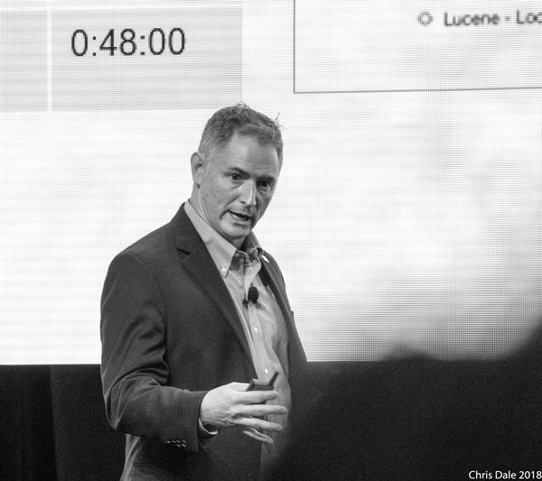 CTO Stephen Stewart had the task of “taking all the things which Nuix does and cramming it into 35 minutes”. He talked first of data lakes (“not data ponds”) which were far from the idealised picture of a clear blue stretch of water once you looked at what was being pumped into them. Nuix, he said, offered speed, consistency and a repeatable and defensible way to queue up the processes and let them run across multiple stores of widely varying data types.