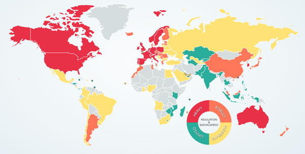The handbook opens with a helpful map showing countries as having heavy, robust, moderate or limited regulation and enforcement in this area, and allowing comparison between two jurisdictions.