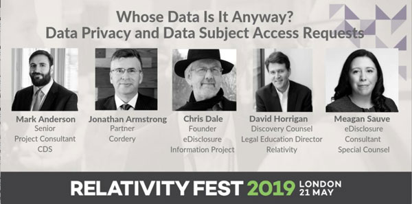 It is called Whose data is it anyway? Data Privacy and Data Subject Access Requests. The other panel members are Mark Anderson, Senior Project Consultant at CDS, Jonathan Armstrong, Partner at Cordery, and Meagan Sauve, eDisclosure Consultant at Special Counsel. David Horrigan of Relativity is the moderator.
