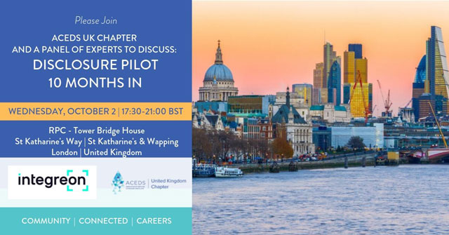 The UK Chapter of ACEDS is presenting a discussion in London on 2 October in association with Integreon. The speakers are Ed Crosse of Simmons & Simmons, Charlotte Hill of the Junior London Solicitors Association, Chief Master Marsh, and Lucinda Orr of Enyo Law.