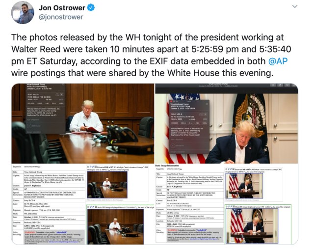 Rather incautiously as seen in retrospect, Trump’s advisers chose to publish the EXIF data behind each picture. That showed that only ten minutes separated the two pictures. If the aim was to show that the president was hard at work, it has backfired. What we see instead is a deliberate falsification of circumstances designed to allay public concern about the President’s health. We instead conclude exactly the opposite.