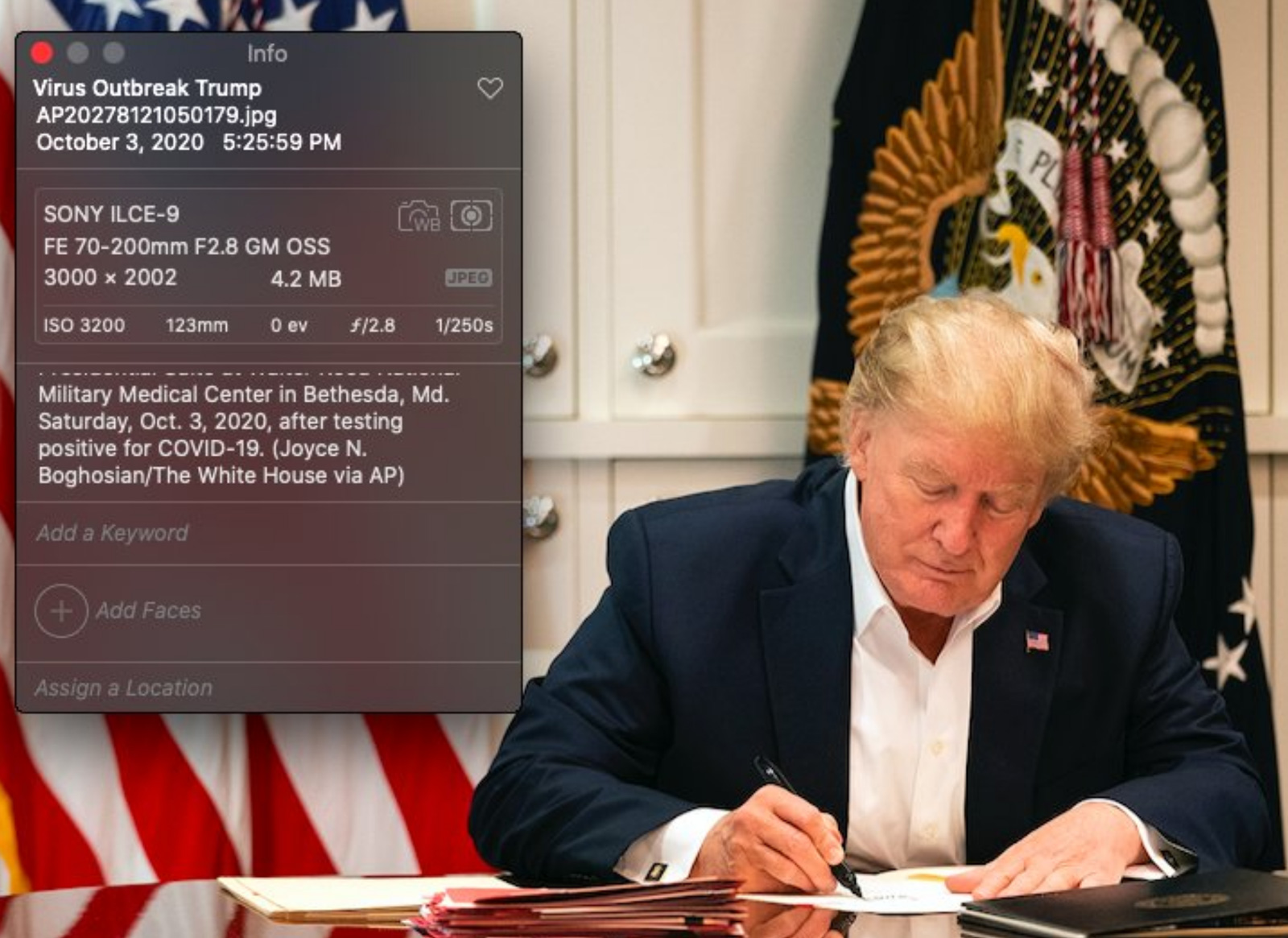 We are almost past caring whether Trump is lying. As with Boris Johnson, it is easiest and best to disbelieve what is said by him or on his behalf unless some external evidence corroborates it. In this case, the unambiguous EXIF data shows the truth behind the reports that Trump was well enough to be working. Instead, all we know is that he was capable of sitting at a desk signing a blank piece of paper (its blankness is another part of the story).
