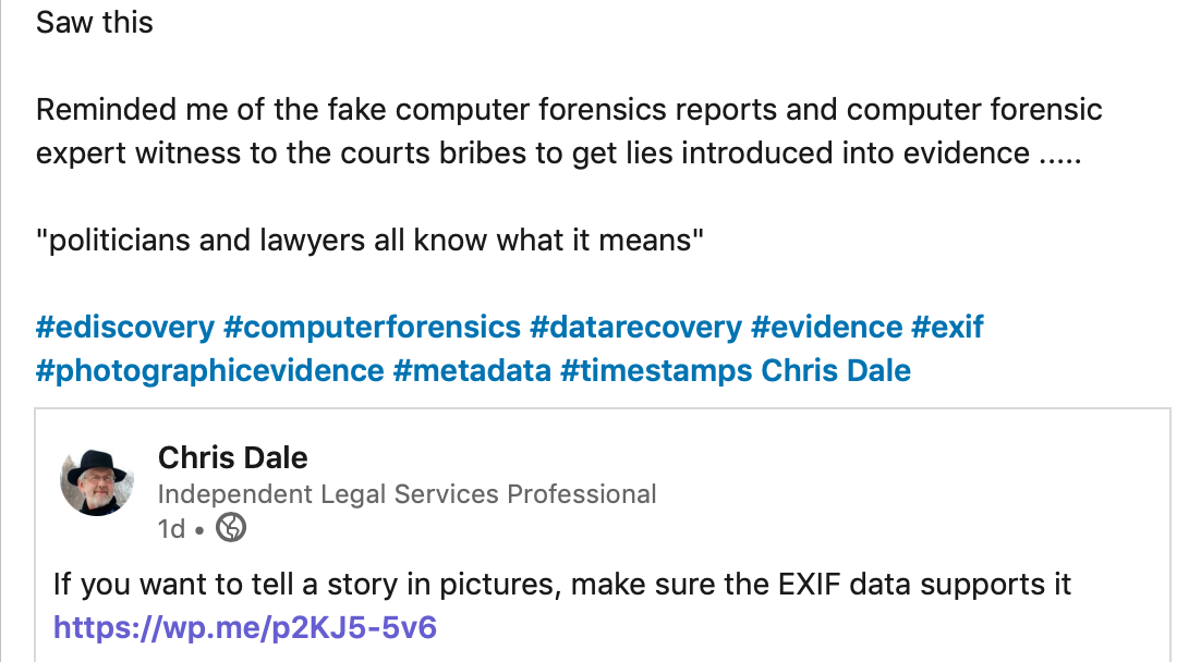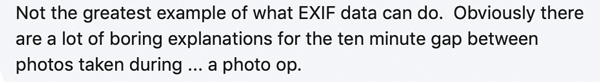 Doubtless there are other articles out there explaining EXIF data for a legal and eDiscovery audience, referencing a case in which it mattered, and fitting it into a topical context. Perhaps the chap would like to point us to them.