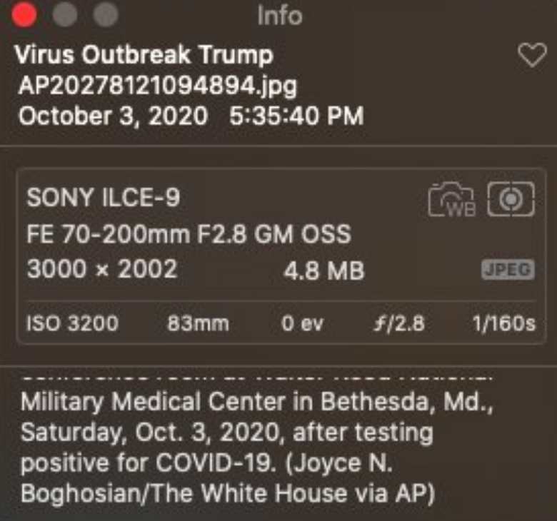 A little man on LinkedIn has challenged the premise of my article about the timing of the Trump hospital photographs. He was rude as well as wrong, but he is not worth powder and shot so I won’t identify him. Another man says that this was “Not the best example of what EXIF can do”. Gosh – how very remiss of me.
