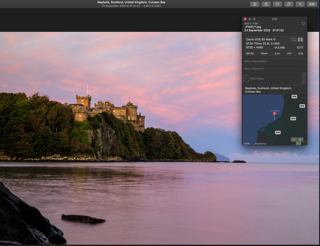 I know the answer anyway, which is why my article’s conclusion is that the two pictures were taken ten minutes apart. Having been challenged on the point, however, we should test it. On 6 October, we exported from RAW (using Lightroom) a photograph which my son Will Dale took on 24 September 2020 at 07:01:52, and looked at the result in Apple Photos.