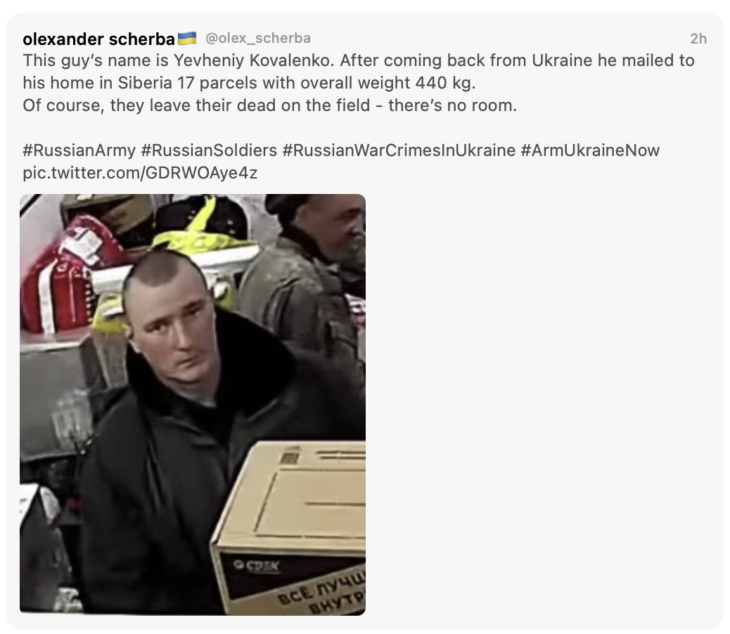 One of the best examples of personal identification is the video frame which shows Russian soldiers packing up stolen property to send home. Many of them have been identified.