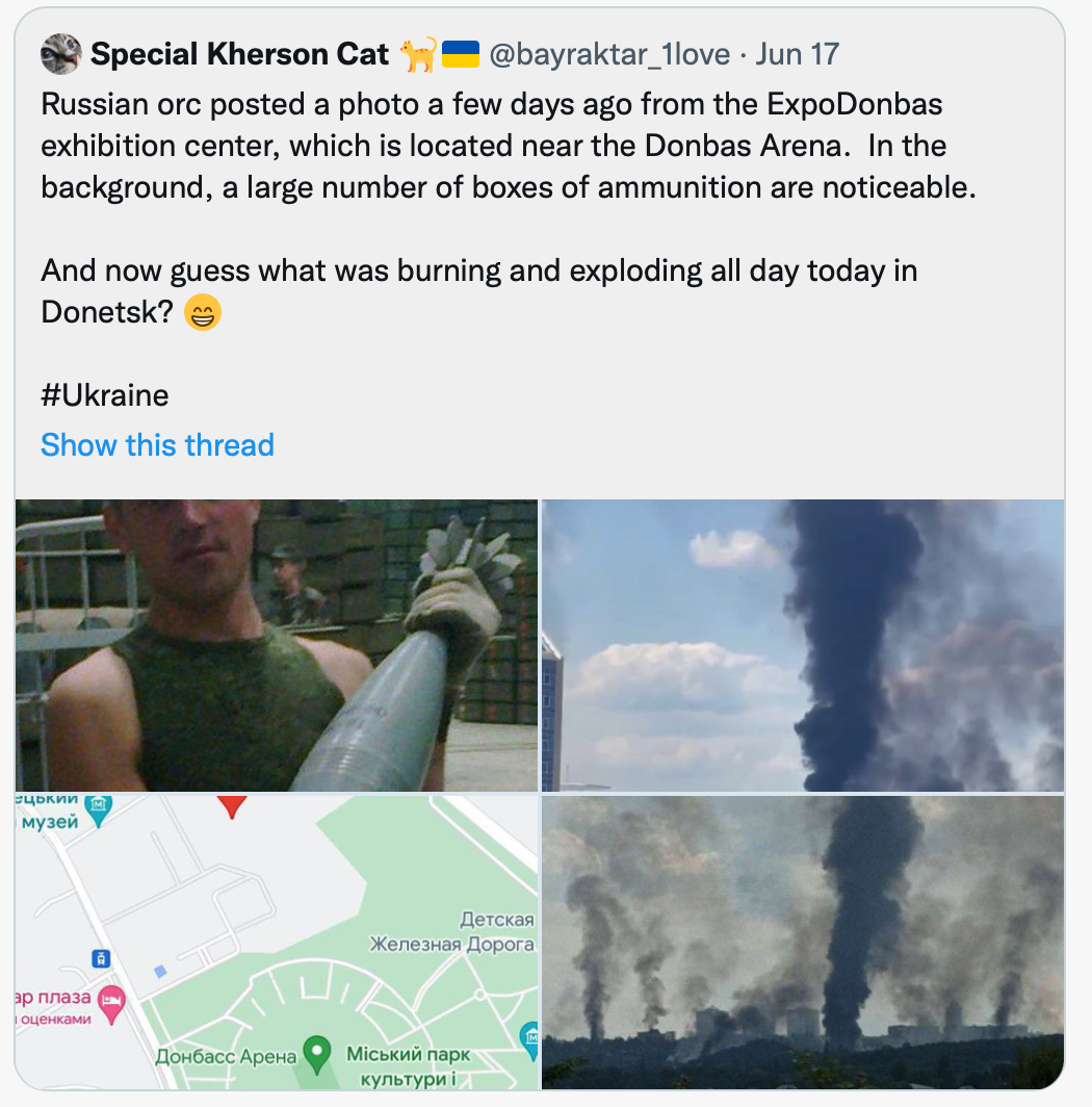 The story is encapsulated in the pictures attached to the tweet below – a Russian soldier posts a picture of himself surrounded by ammunition and publishes it complete with GPS information which enables Ukrainian artillery to blow the store to bits.